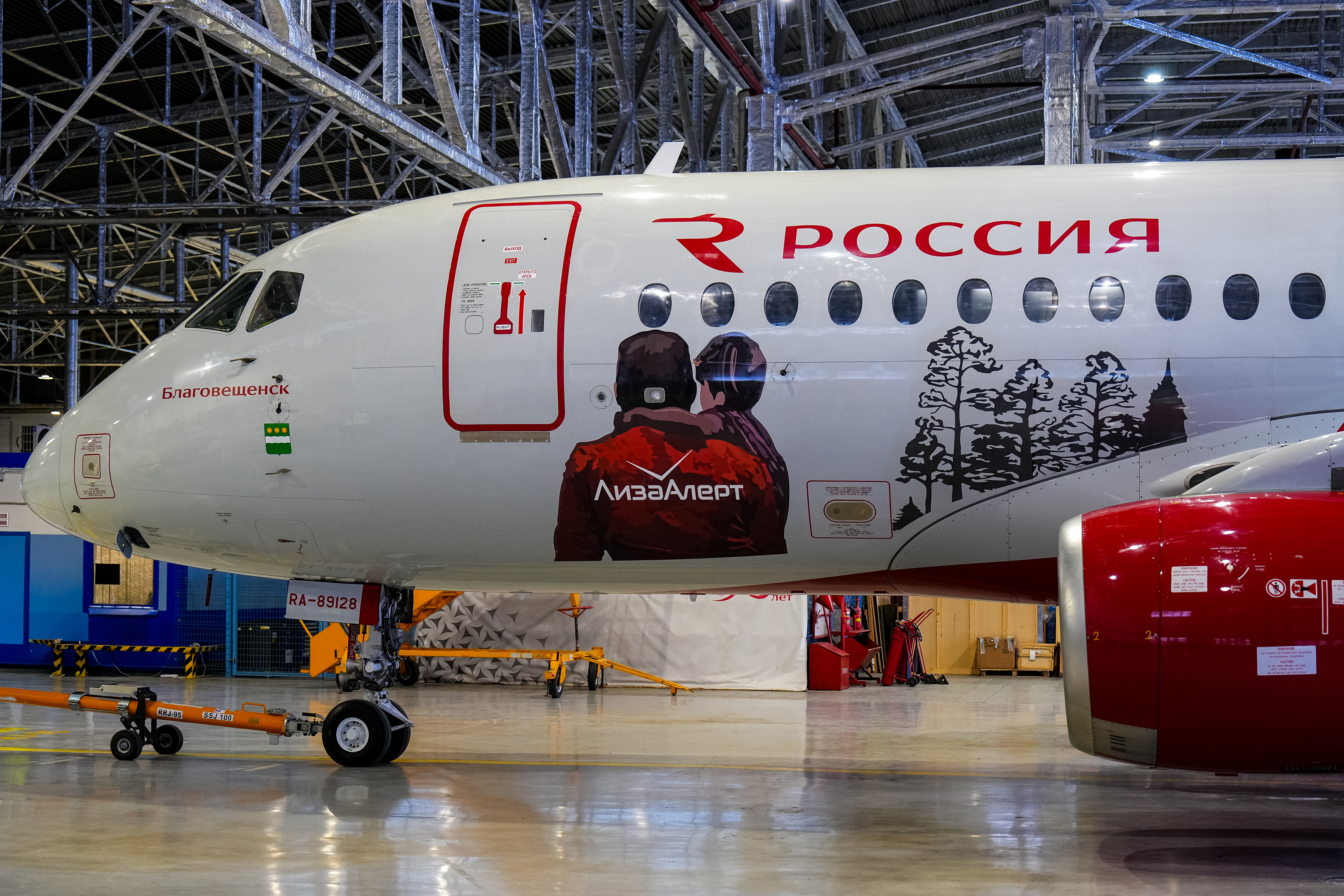 22 декабря 2025 года. Санкт-Петербург. Авиакомпания «Россия» (входит в Группу «Аэрофлот») презентовала в Санкт-Петербурге уникальную тематическую ливрею самолёта SSJ-100 (RA-89128), посвящённой деятельности добровольческого поисково-спасательного отряда «ЛизаАлерт», который занимается поиском пропавших людей по всей России.